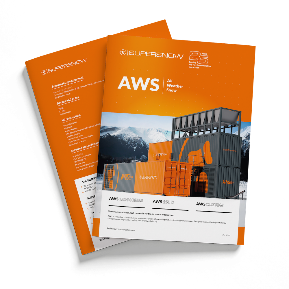 AWS 150 D to nowoczesny system do produkcji śniegu, który działa niezależnie od pory roku i warunków pogodowych. Dzięki zaawansowanej technologii chłodzenia i przemyślanej konstrukcji kontenerowej, urządzenie pozwala tworzyć naturalny w dotyku, wysokiej jakości śnieg – zawsze wtedy, gdy jest potrzebny.