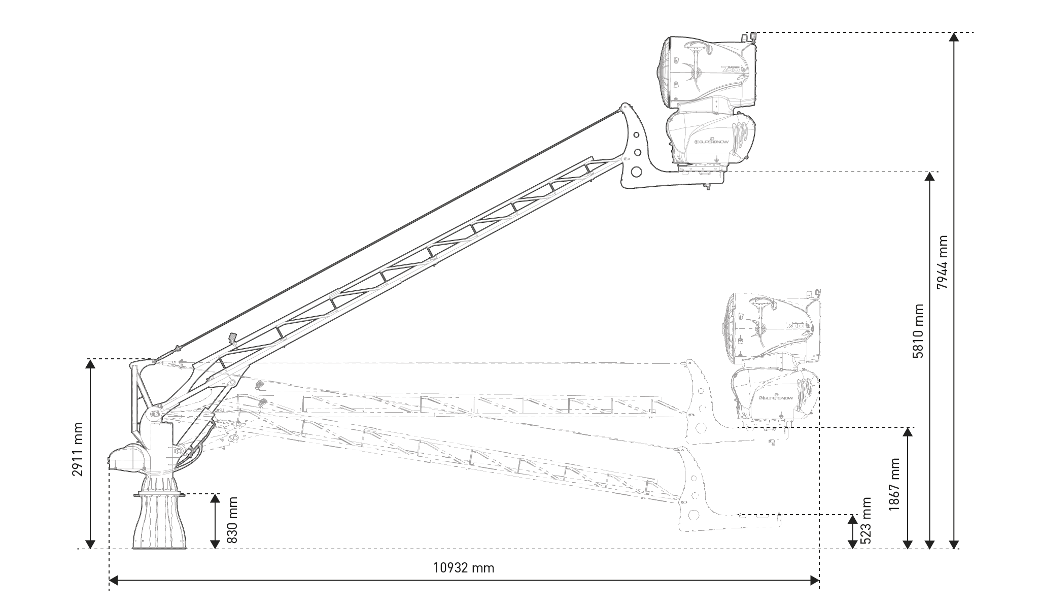 - Podstawa wysięgnika H800 z kompletnym układem hydraulicznym (zasilanie ~3 P, 400 V, 2,2 kW) i z uchwytem na panel operatorski armatki