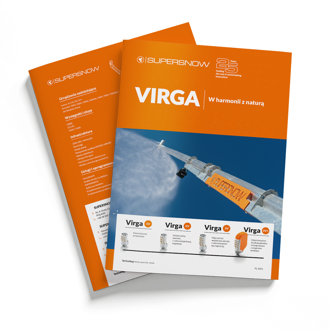 Virga to lanca śnieżna inspirowana zjawiskiem virgi: zamiast wyparowywać, krople wody w kontrolowany sposób zamarzają w powietrzu i tworzą warstwę śniegu o jednorodnej strukturze. To rozwiązanie o bardzo niskim zużyciu energii, zaprojektowane zarówno dla mniejszych ośrodków (wariant ekonomiczny), jak i dużych systemów (wersje autonomiczne i systemowe).